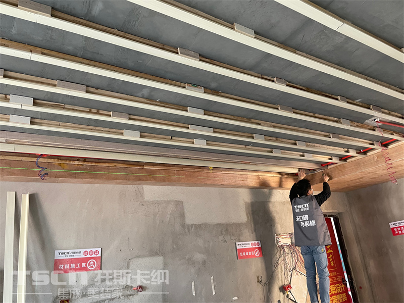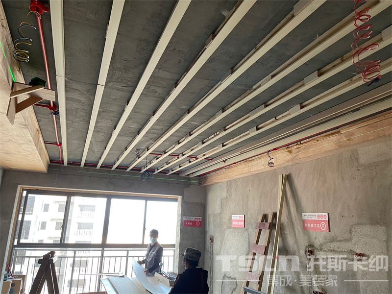 這是一套樣板房施工現(xiàn)場,施工物料的布置、頂面龍骨打底的施工場景嚴(yán)格按照公司標(biāo)準(zhǔn),以確保裝修過程的整潔無錯(cuò)漏。